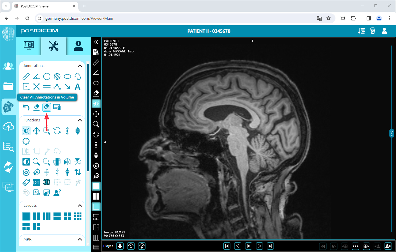 For clearing annotations you have made in all images in the series, click on the “Clear All” icon in the “Annotations” field on the upper left side of the page.