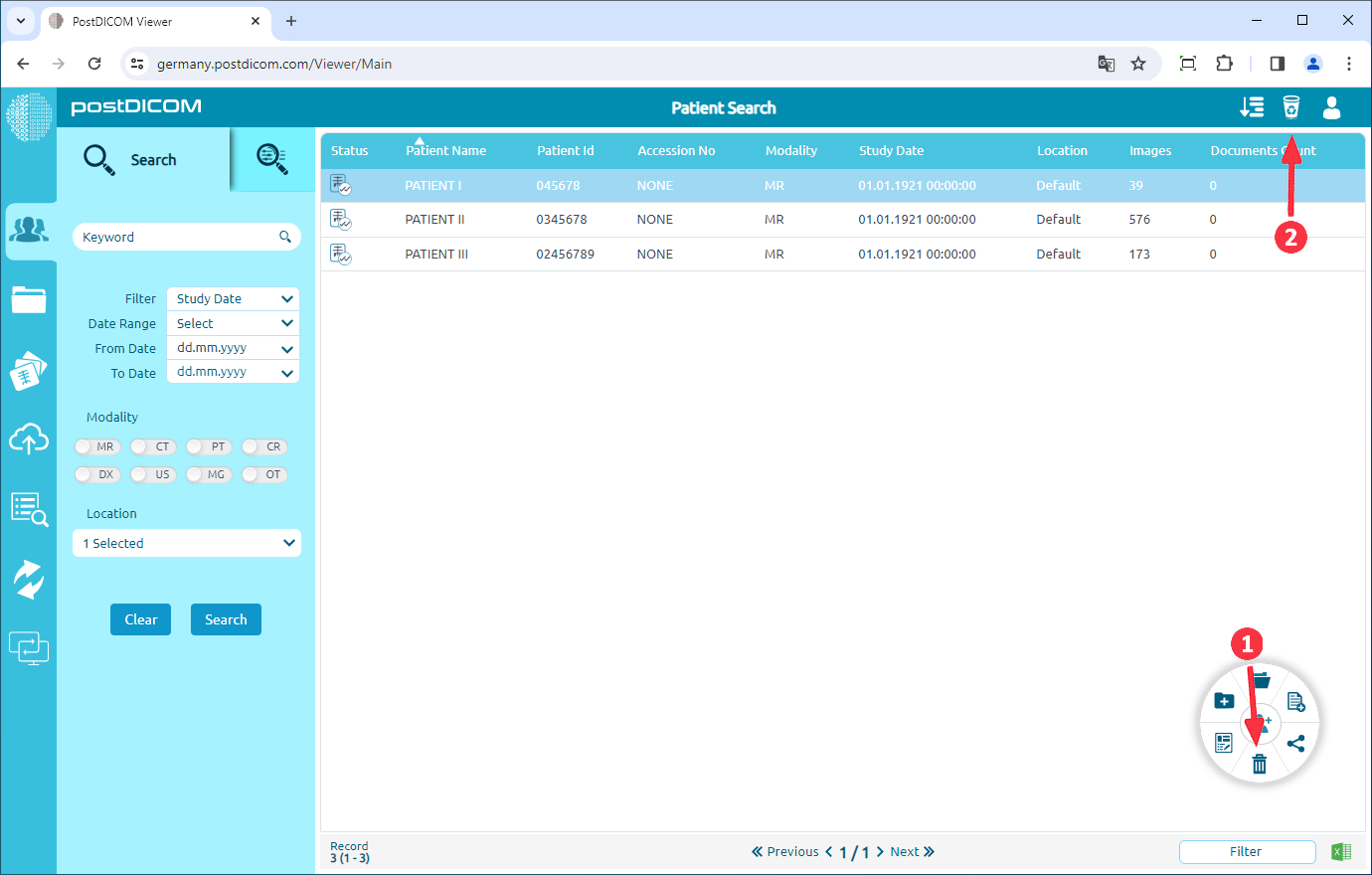 On "Patient Search" page, you will see all patient orders with patient name, patient id, accession no, modality,study date,location, images count columns information.